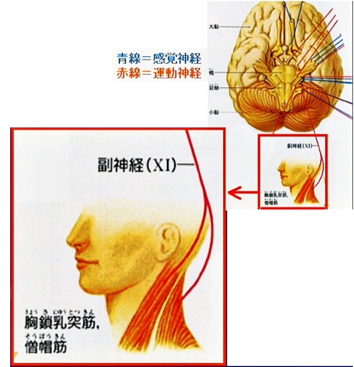 副神経は、延髄と脊髄(頸髄)から出て、首の横を通り、胸鎖乳突筋と僧帽筋に信号を送っています。